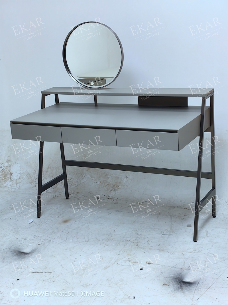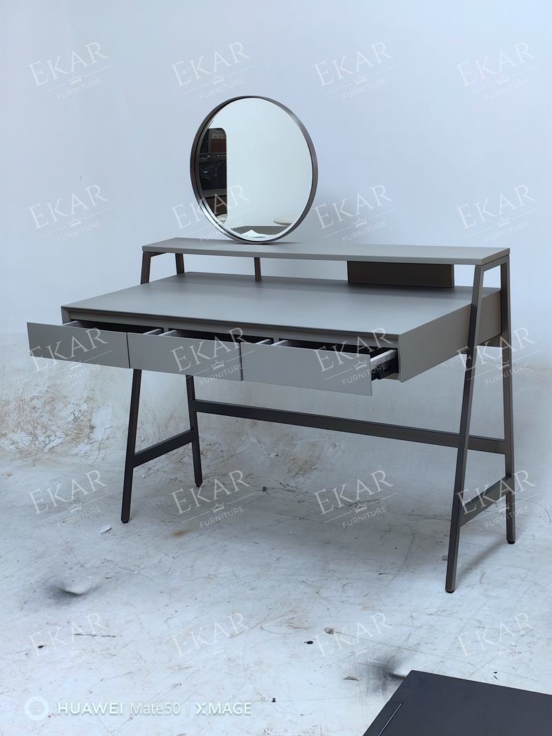 This sleek vanity table features a modern design with an integrated mirror, perfect for contemporary bedroom decor.